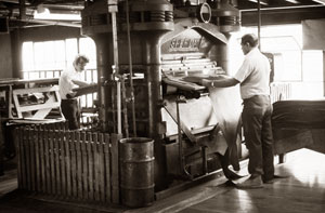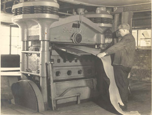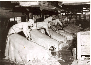 Two men pressing the leather near the end of the tanning process in an American tannery.