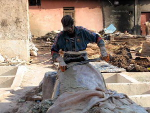 Marrakech tannery worker removing fat by hand (processing your imported leather)