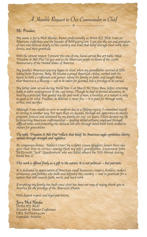 ...is respectfully presented as a gift in honor of our “Peace Through Strength” to President Donald J. Trump and the American people, as a lasting testament to American-made craftsmanship, national pride, and the principle that freedom is never free.