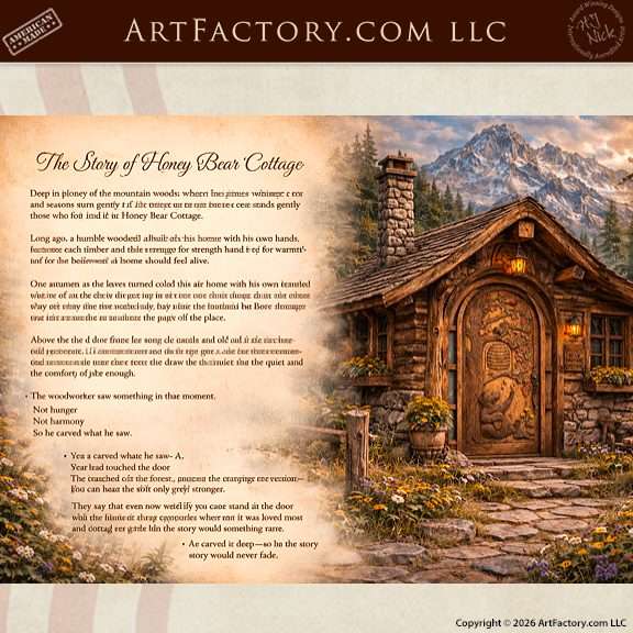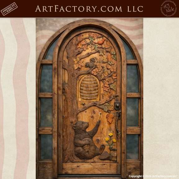 Honey Bear Cottage is a hand-carved tribute to harmony and nature. This artisan-crafted entryway features intricate high-relief carvings of a bear and beehive, symbolizing the sweetness of a life shared in trust. Built from premium timbers and shaped by master woodworkers, it is more than a door — it is a living legacy that brings the quiet warmth of the mountain woods to your home.