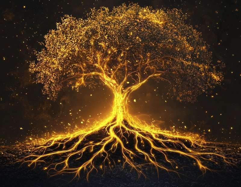 Deep, interwoven roots symbolize heritage and foundation. The rising trunk reflects resilience through time. Branches reach toward the sun and moon — strength balanced by wisdom.