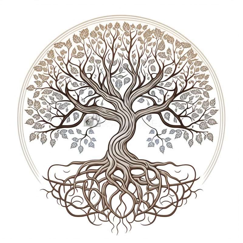 Deep, interwoven roots symbolize heritage and foundation. The rising trunk reflects resilience through time. Branches reach toward the sun and moon — strength balanced by wisdom.