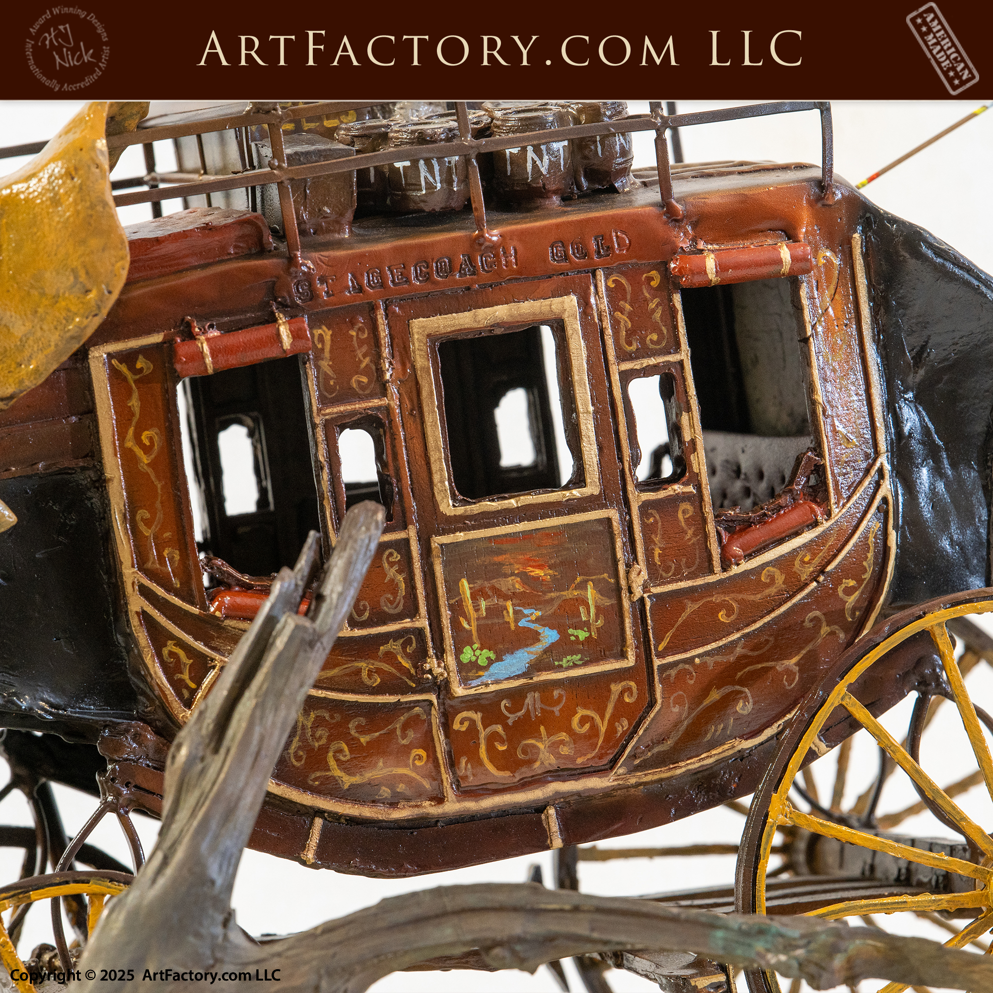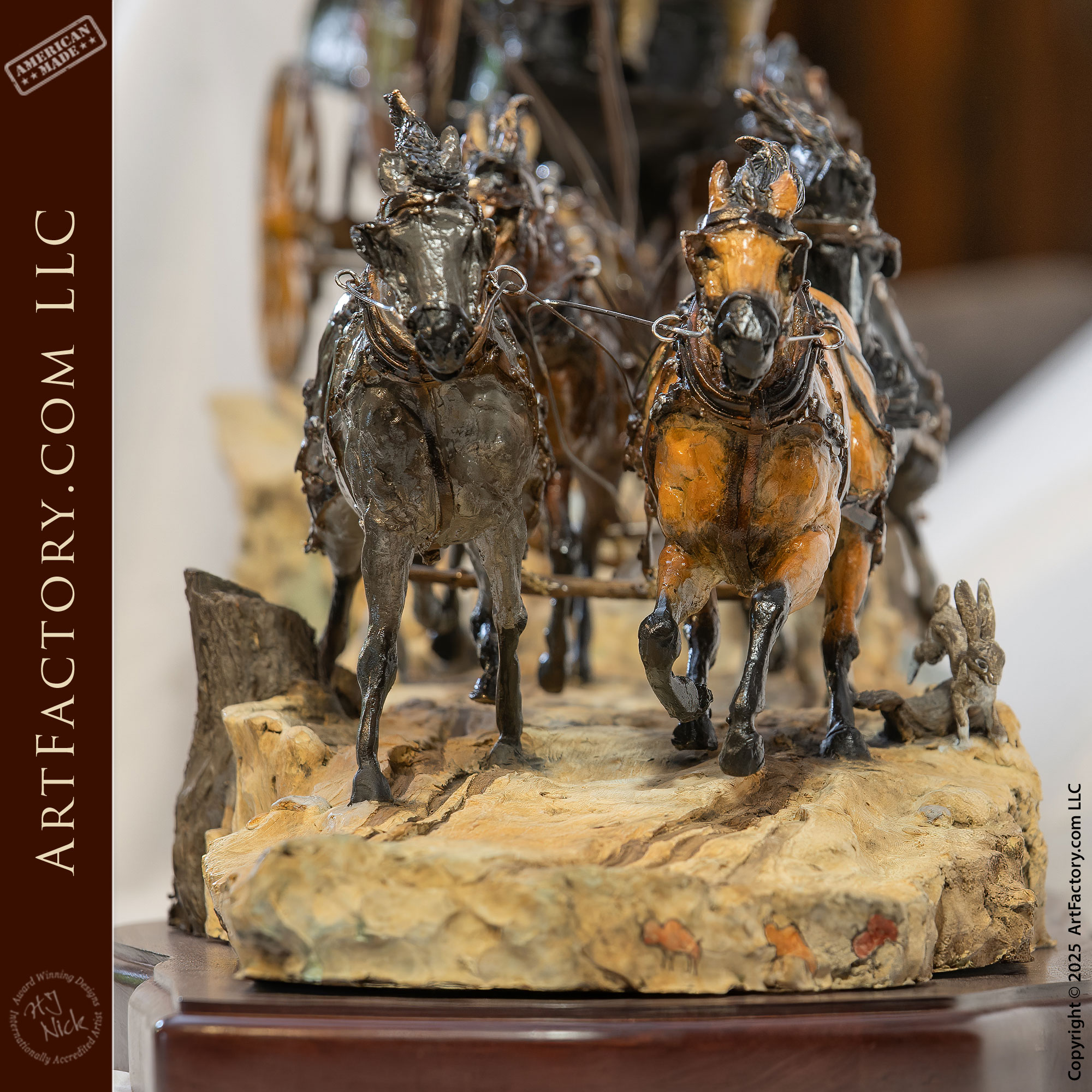 Today, that same frontier energy lives on in Stage Coach Gold, a breathtaking bronze sculpture by Laran Ghiglieri. With six horses thundering forward and the coach charging into old western history, this piece immortalizes the spirit of the Old West in motion. Every detail is masterfully captured, from the grit of the trail to the tension of the reins.