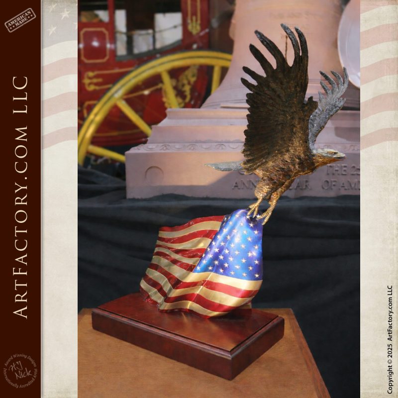 The American Eagle Carries the American Flag. Every sculpture is certified and authenticated under the endorsement of H.J. Nick and ArtFactory.com, continuing patriotic tradition of master-built American art.