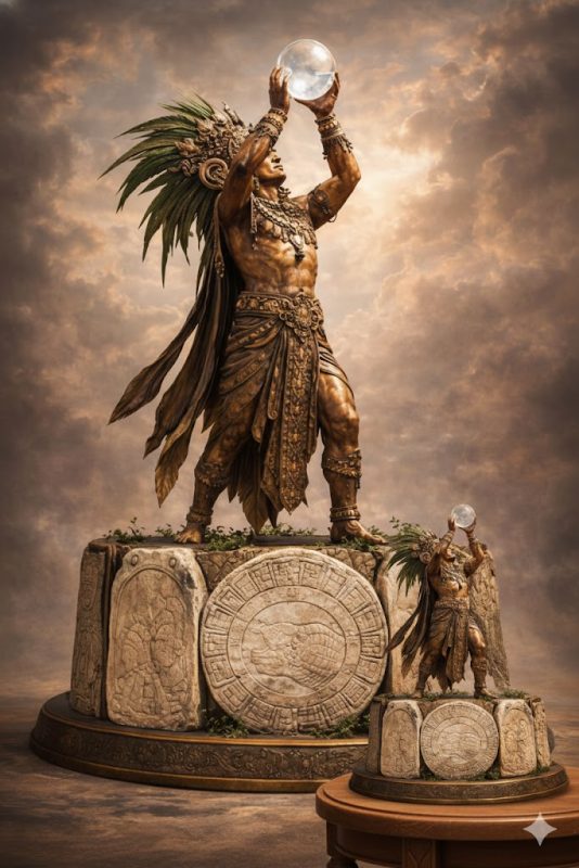 The Celestial Bearer represents the archetypal Maya ruler-priest acting as an intermediary between the ancestral past, the living present, and the celestial order. By raising a sacred celestial sphere toward the heavens while standing upon ancestral stone, the figure embodies Classic Maya beliefs in dynastic continuity, ritual authority, and the cosmic foundations of kingship.