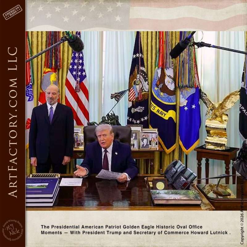 From its commanding perch, The Golden Presidential American Patriot stands watch as the business of a
