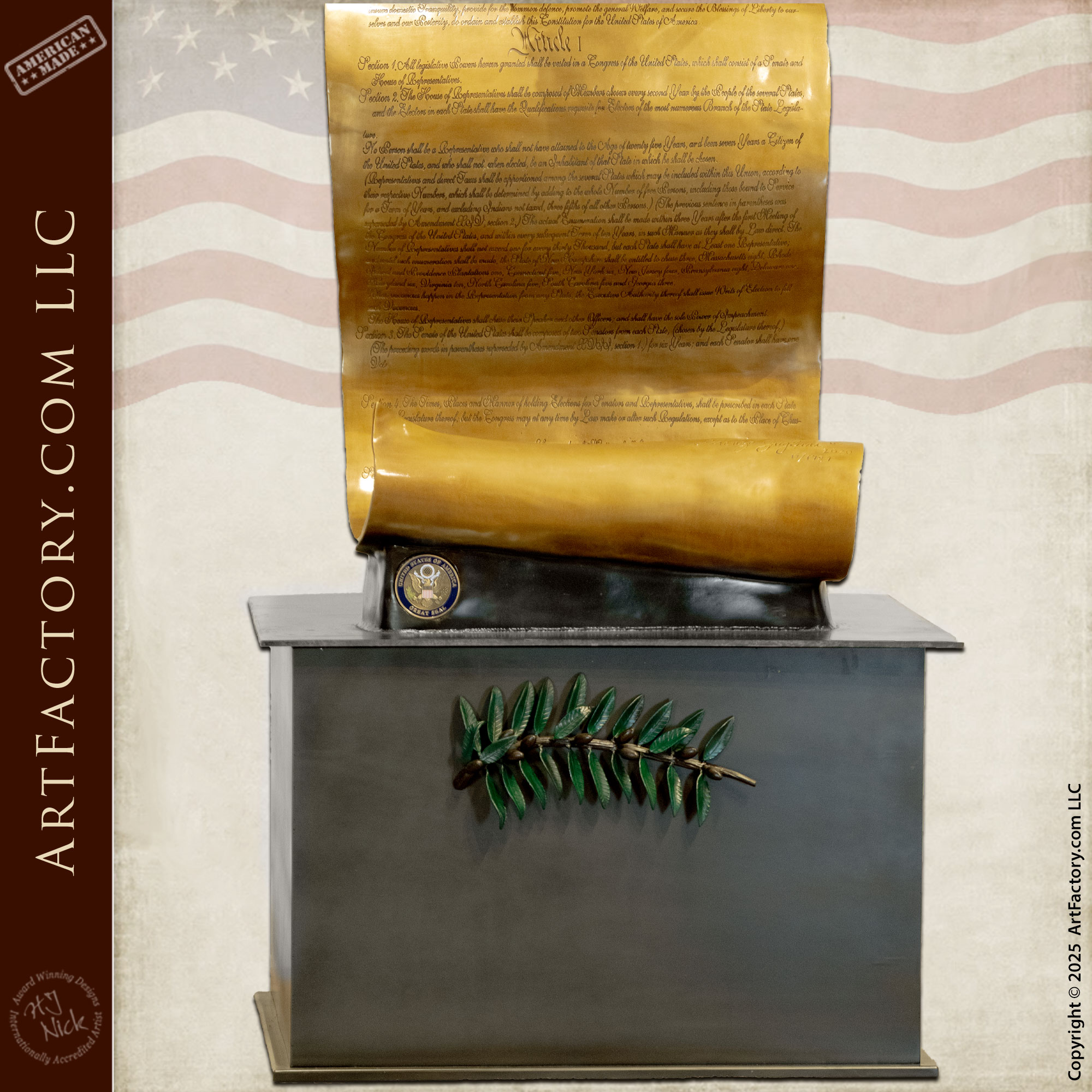 Designed by H.J. Nick and ArtFactory.com, the hand-forged wrought iron pedestal with an olive branch base elevates the sculpture, enhancing its commanding presence. This addition, along with the Constitution scroll crafted under the leadership of Mark Russo, strengthens the sculpture’s historical and artistic importance.