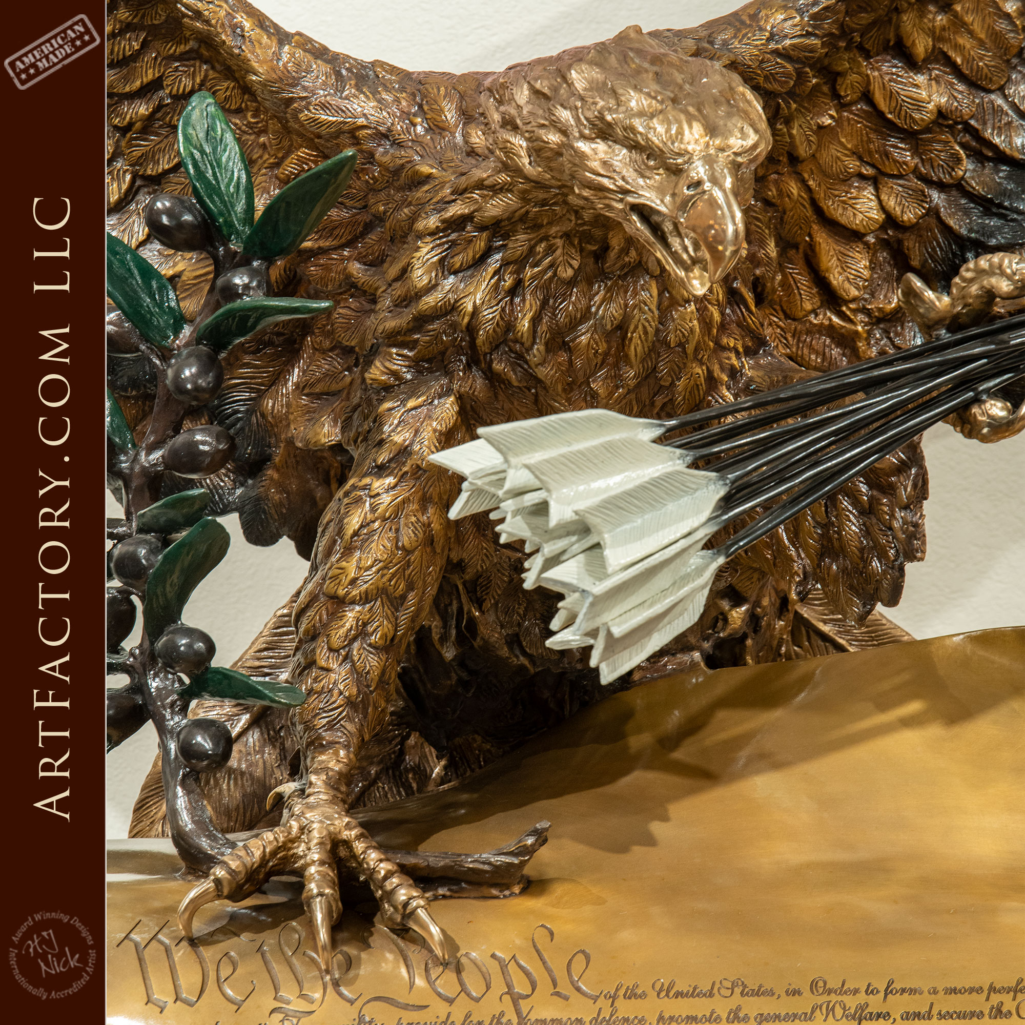 The Presidential American Patriot life-size bronze eagle sculpture stands as a monumental tribute to American ideals, encapsulating the essence of freedom and democracy through its intricate artistry. The majestic eagle’s powerful stance, gripping the Constitution, conveys a timeless message of resilience and national pride.